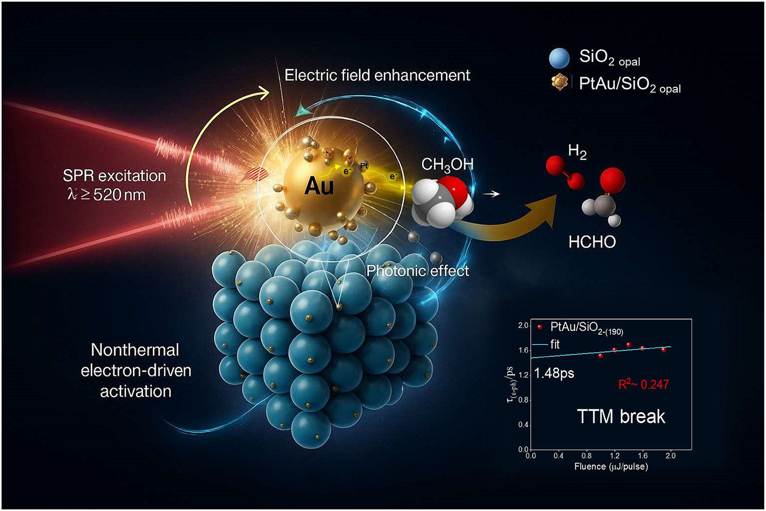 我室太阳能研究部(DNL16)李灿院士团队在等离激元耦合光子晶体光催化研究中取得新进展。团队通过将金(Au)等离激元纳米颗粒组装在二氧化硅(SiO2)光子晶体中,并辅之以铂(Pt)催化剂,构建了三维催化剂PtAu/SiO2,实现了光子和等离激元量子效应的协同,进而以光催化甲醇脱氢为指标反应,揭示了其中非热载流子机制的主导作用,为高效太阳能光催化转化提供了新思路。