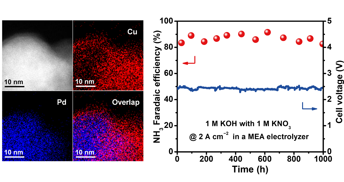 我室纳米与界面催化研究中心包信和院士团队在电化学合成氨研究中取得新进展。研究团队通过电化学原位重构策略,构建了高效电化学还原硝酸盐合成氨的铜-氢化钯(Cu–PdHx)界面活性位点,实现了膜电极电解器件中1000小时工业级电流密度制氨,并开展了合成氨电堆放大示范。