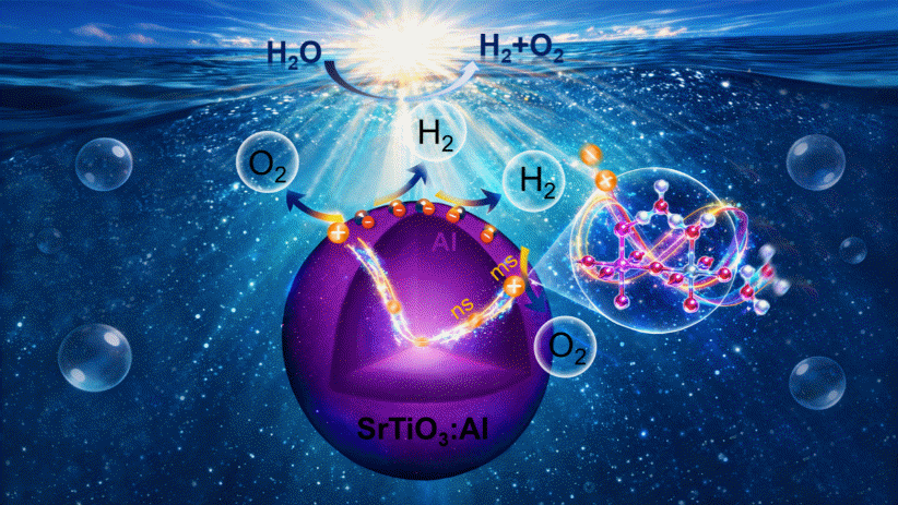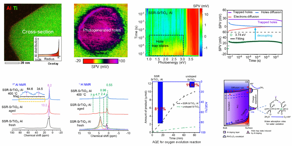 在本工作中,团队以表观量子效率(AQE)超过90%的掺铝钛酸锶(SrTiO3:Al)光催化剂为研究体系,结合时空分辨表面光电压技术与多种光谱表征手段,揭示了Al掺杂在促进光生空穴高效分离与寿命延长方面的决定性作用,并进一步明确其与表面水吸附及氧化反应中心直接相关。研究表明,光生电荷分离动力学与表面催化反应动力学之间的时空耦合是实现高效光催化全分解水反应的决定性因素。