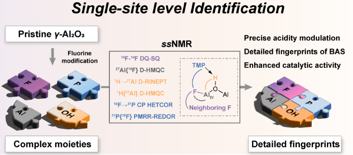我室纳米与界面催化研究中心固体核磁共振及前沿应用研究组(524组)侯广进研究员、纪毅副研究员团队在氟化氧化铝表面酸位点精准解析研究中取得新进展。团队利用高场、超快魔角旋转及多维多核固体核磁共振技术,在原子尺度上实现了对氟化氧化铝表面强Brønsted酸位点结构的精准识别,并揭示其形成机制与催化性能的直接关联。
