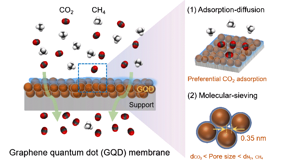 我室无机膜与催化新材料研究组(504组)杨维慎研究员、朱雪峰研究员团队提出一种后调控策略,制备出孔结构可调的石墨烯量子点(GQD)膜,实现了二氧化碳和氮气(CO2/N2),二氧化碳和甲烷(CO2/CH4),以及丙烯和丙烷(C3H6/C3H8)等体系的气体分离。